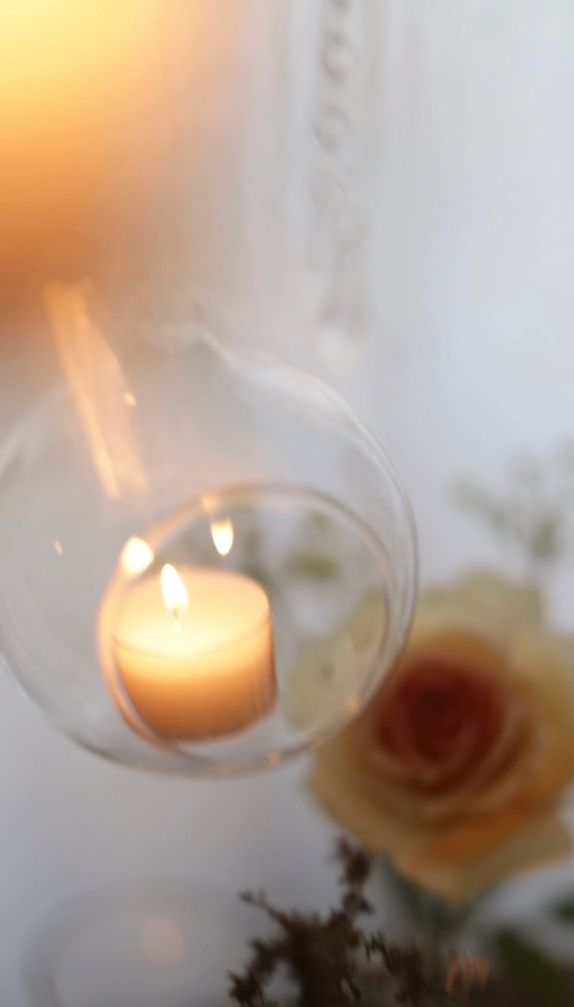 Clear orbs of glass with glass loop at the top and circular opening on one side. Use with tea light candles to create floating baubles of light for absolute event magic